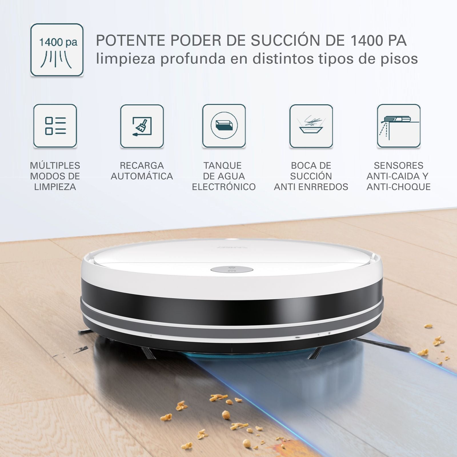 Su potente motor de 1400pa asegura una succión efectiva, mientras que sus sensores anti choque y anti caída lo guían con seguridad. Además, sus ruedas de goma anti-marcas aseguran un desplazamiento suave en cualquier superficie a la vez que le permiten superar obstáculos de hasta 15 mm.