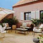 Versátil y acogedor, este conjunto de jardín consta de un sofá, sillones y una mesa de centro, y ofrece múltiples opciones de disposición para acomodar cómodamente a sus invitados. La combinación de elementos crea un espacio flexible y dinámico, ideal tanto para relajarse bajo el sol como para momentos de convivencia.